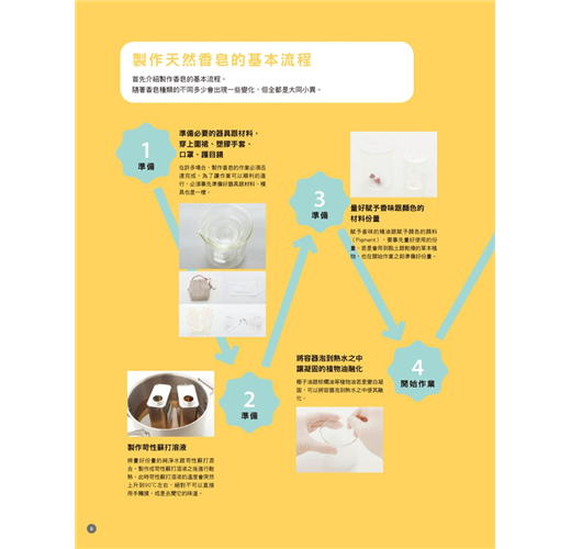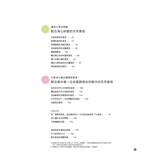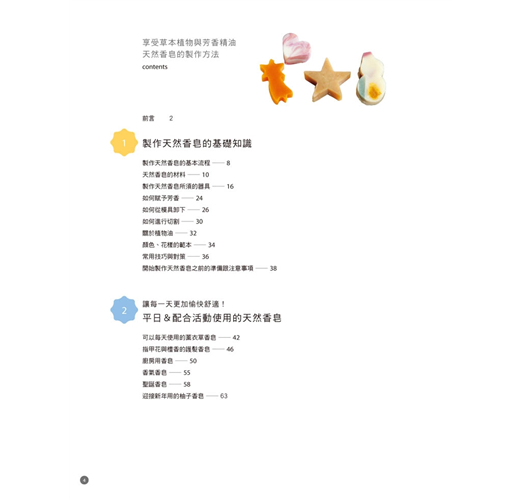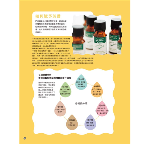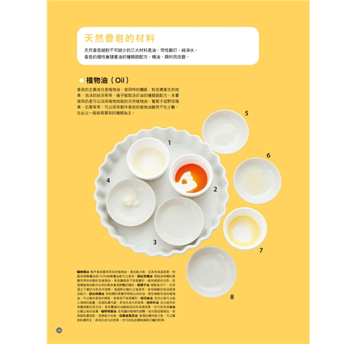 以本書使用到的種類為主,介紹使用製作香皂時常會用到的精油跟草本植物的特徵,並提供專業用語集幫助讀者進一步瞭解製作手工香皂的術語。另外,在製作手工香皂時常會遇到的問題,也有Q&A專欄來回答各位讀者心中的疑問喔!