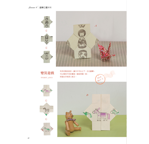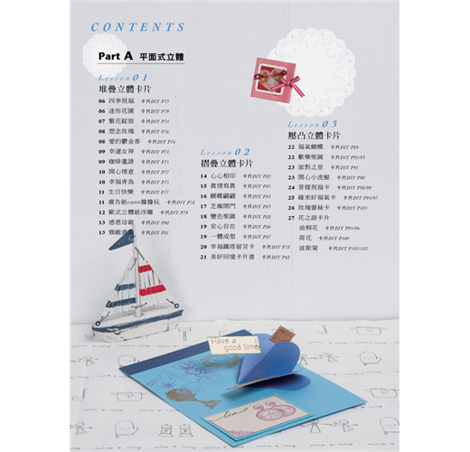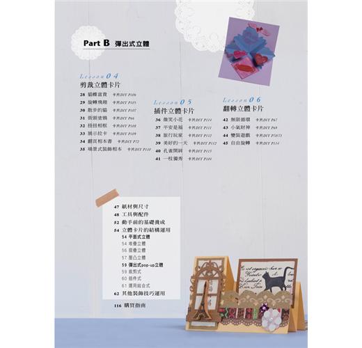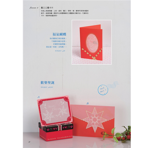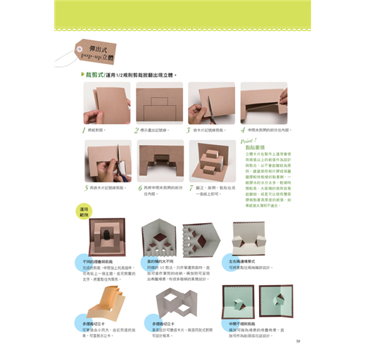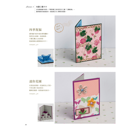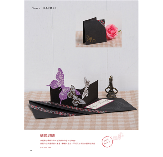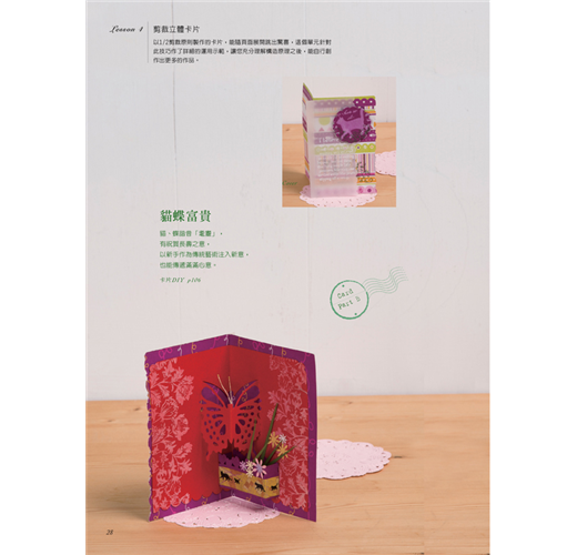 ◆從裁切、摺疊、黏貼等製作基礎開始,教您如何運用這些基本技巧製作3D的立體浮雕卡、展開翅膀會旋轉的卡片…,豐富每個紀念日。