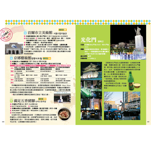 ◆內容精采多樣:設計有吃、買、玩等景點與店家之外,還有「13專輯」、「朴太太便利貼」、「魅力特區」等單元,讓讀者更深入了解首爾的人文風情。
