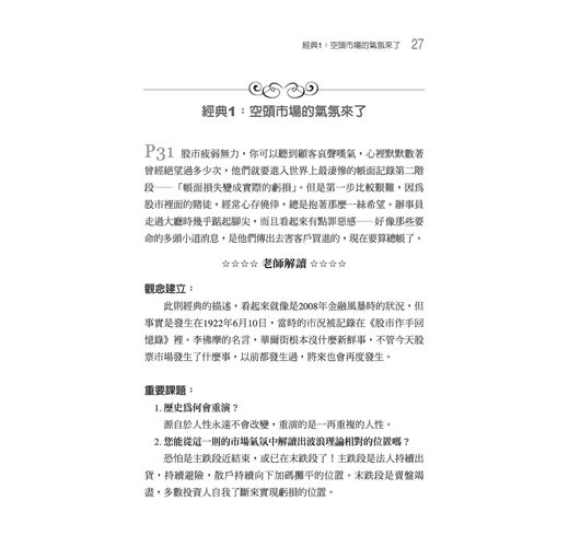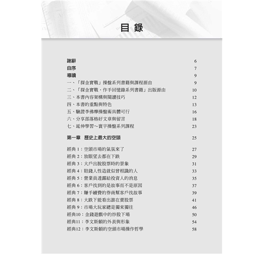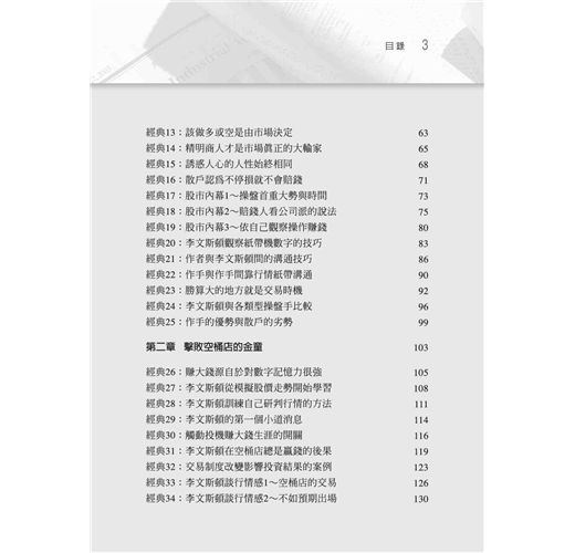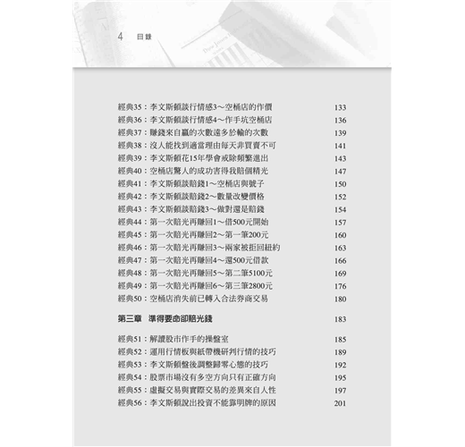 原著開宗明義說明李文斯頓在空桶店與合法經紀商進行投資的經歷。他在空桶店的獲利,主要來自紙帶機研判行情的技巧;而在合法經紀商營業處投機成功,則應該歸功於運用頭腦和知識。透過李文斯頓的歷練,本書將幫助讀者,從他敘述的道理中發掘出賺錢的邏輯。