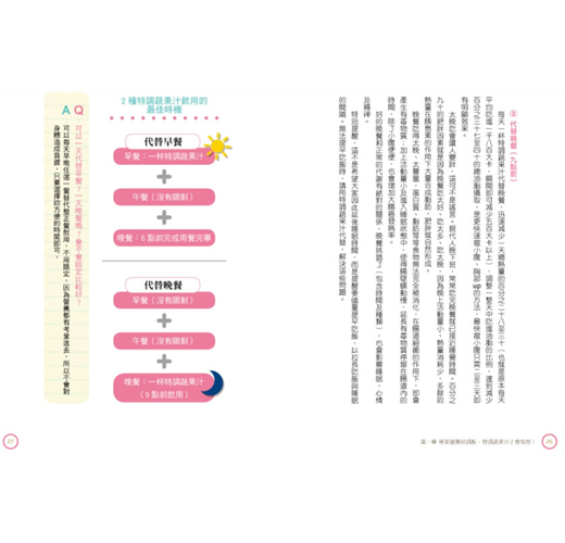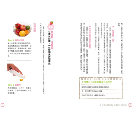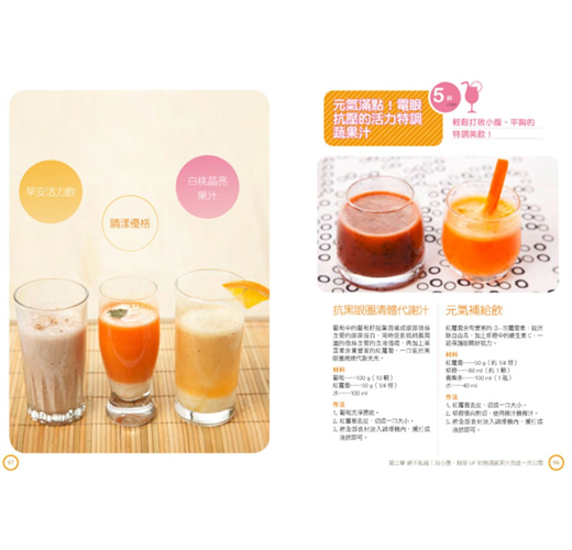 ★不復胖!搭配正餐的一日食譜建議特調蔬果汁可代替早餐或晚餐,而只要代替其中某一餐後,另外兩餐則不用特別限制,但如果你想要加快速瘦身的話,書裡就特別提供一日的食譜建議,助你一臂之力。食譜中的分量及熱量是經過計算,可以維持最基本的基礎代謝率及均衡的營養素,短期即可加速看到效果,而且長期實踐更不會復胖。