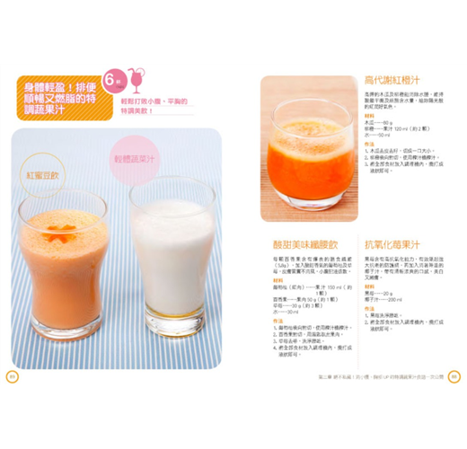 ★2種特調蔬果汁飲用時間任選,都很有效,更符合自己的需求:許多上班族早上常常急急忙忙趕著出門上班,根本沒有時間打蔬果汁,本書所設計的特調蔬果汁,可以因應個人需求,任選早晚飲用,不用再被時間綁死,選擇更多元,瘦得更無負擔。