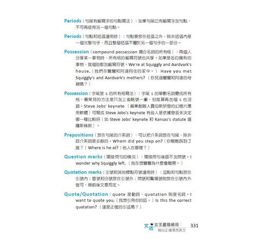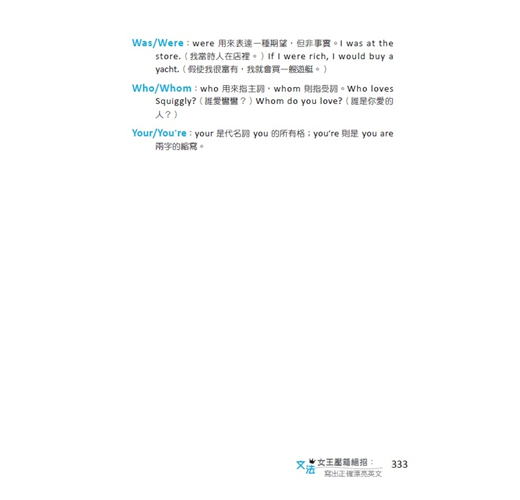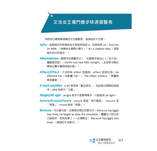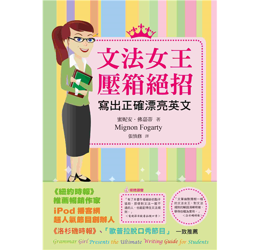 作者我可是堂堂文法女王,不但職業是幫人指正文法,甚至還上 iPod 的播客網主持節目。(歡迎大家在 iTunes 視頻搜尋我的節目。)用英文寫作本來就很傷腦筋,如果還要記一大堆文法規則,根本沒有人受得了!所以身為文法女王,我的使命就是把複雜的規則解釋得人人易懂。