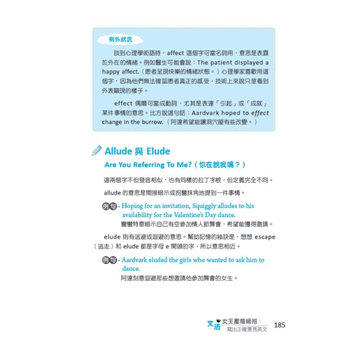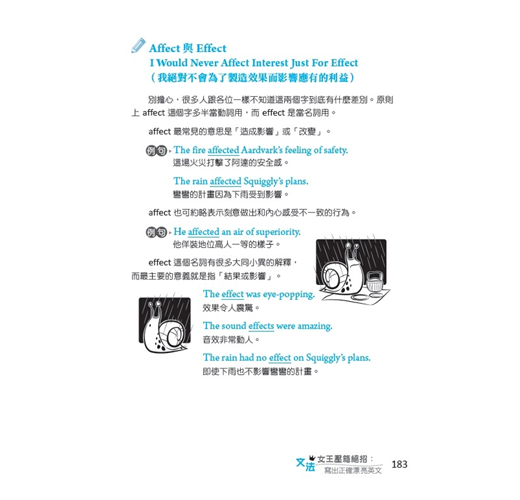 這本書不是普通的文法大全,也沒有要介紹如莎翁般咬文嚼字的老掉牙規則。我要分享的是「文法女王獨門撇步」,除了各種圖解輔助和千奇百怪增強記憶的口訣之外,本書還列舉許多實用工具、好玩好記的例句以及文法相關的卡通插畫,主角是一隻名叫阿達的食蟻獸和一隻名叫彎彎的蝸牛。各位把這些撇步通通學起來,就可以隨心所欲把自己的想法或研究心得化為文字。