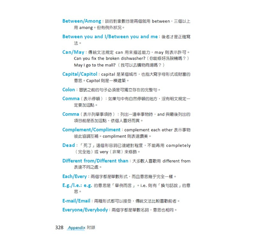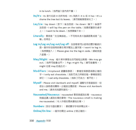 我在書中提供一些文字運用和潤飾修改的祕訣,可以讓各位交出去的作業脫胎換骨,不會被老師評為 redundant(累贅)、awkward(奇怪)、confusing(看不懂)。至於電子郵件、一般書信、手機簡訊和研究報告等到底該怎麼寫,本書也會另做補充說明。此外我還設立了一個網站,上面有很多文法測驗和練習,幫助大家把所學的知識進一步吸收強化。