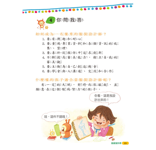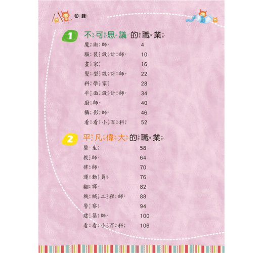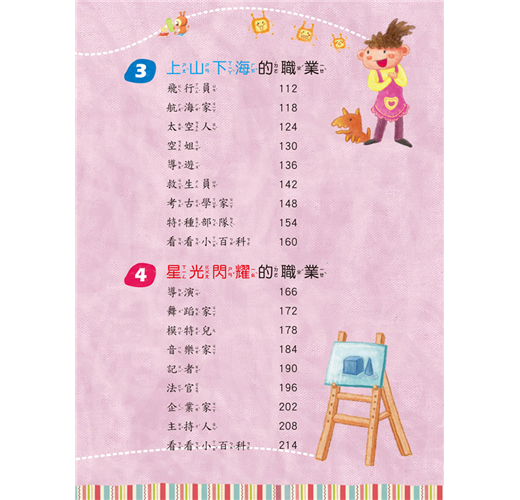 「要收穫先要付出」,天下沒有白吃的午餐,每個孩子從小都有夢想,但想要達到並不是一蹴可成,必須要先了解實現理想應該要做的準備及功課,並努力堅持的朝向目標前進,才可能有成功的機會。本書將職業分為四大主題,以圖畫方式說明每項職業的工作內容,並推舉各行各業中著名的成功人士,更加激勵孩子對未來的期許與展望,並幫助他們獲得更多的正確觀念。
