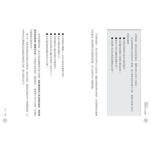 解說的目的,就是讓別人看見你的點子、產品或服務有什麼價值──而且是對他們而言的價值,而不是對你!所以,與其說你的新產品擁有獨步業界的創新,不如說它可以幫對方節省百分之多少的時間!