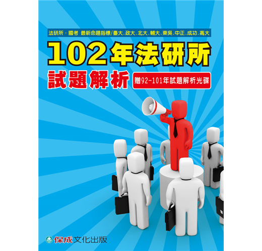 鑑於近年修法頻繁,本公司為貫徹「良心經營,真心回饋」之理念,不惜鉅資,獨家配合各法最新修正條文、實務見解暨各校命題老師之學說見解,全新編製「102年法研所試題解析」,以饗讀者。