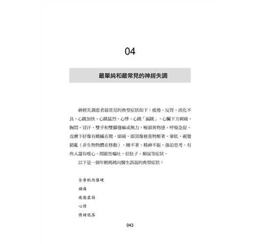 生活在節奏緊張、充滿壓力的社會,許多人不時會緊張冒汗、心跳加快、心悸、發抖、頭痛、失眠、心神不寧、呼吸困難、腸胃不適……整天這裡不舒服、那裡不痛快,看了醫生也不見好轉,檢查又一切正常。你會想「我到底怎麼了?」你有可能患了神經失調(精神官能症),這是由焦慮引起的身心疾病,你愈是焦慮不安,身體就會愈不舒服。嚴重者甚至會出現憂鬱症、恐慌症、強迫症等。