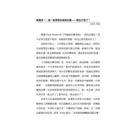 閱讀Claire Weekes的《幸福就在轉念後》,我的直覺是:我不必再去想要不要寫一本衛教的書籍,因為已經有最好的了!