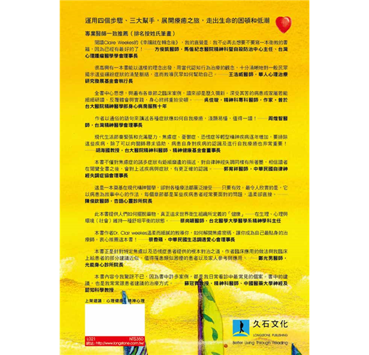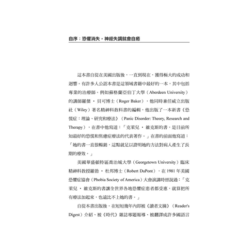 很高興有一本書能以這樣的理念出發,用當代認知行為治療的觀念,十分清晰地對一般民眾揭示這些繽紛症狀的清楚脈絡,進而教導民眾如何幫助自己。雖然許多觀念可能因為不同的文化或社會結構而較不傳神,但是在華文世界而言,這確實是值得推薦的一本書。