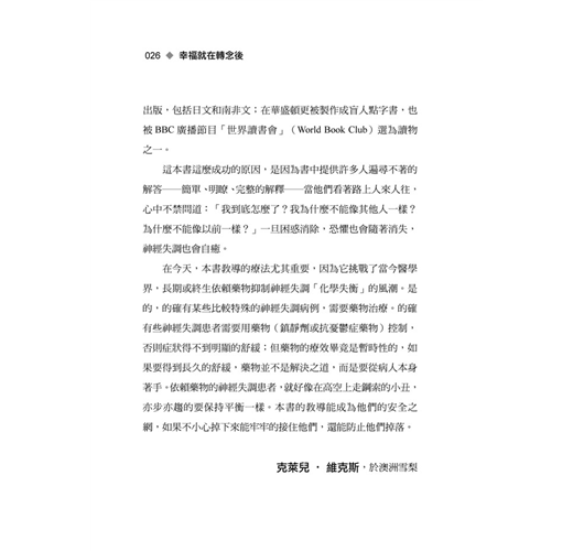 本書不只是寫給神經失調患者,更是寫給患者家屬,唯有他們能夠理解患者面臨的處境和煎熬,才能具備同理心,幫助家人渡過難關。