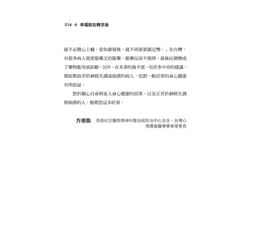 《幸福就在轉念後》是一本深入淺出,描述精確,而且關懷讀者需求,不可多得的佳作。我的門診總是有一些受苦於神經失調或崩潰的初診病人,每次在診斷性會談結束後,我就是沒辦法只開個藥就讓病人離開,因為我不想讓他們一知半解,長期服藥或害怕服藥,導致治療不完全;然而,仔細地從中樞神經、自律神經,一直講解到神經病理,都要花上好多時間,雖然病人與家屬很高興,但是我卻要看門診看到累垮自己。我一直在想,如果有本好書,就太好了!慶幸的是:現在就有了!