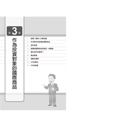股票、債券、分散投資/作為替代性投資的國際商品/沒有利息/股票與國際商品的相似、相異處/真的沒有利息嗎?/商品期貨/連動式債券/ETF的增加/ETF的架構