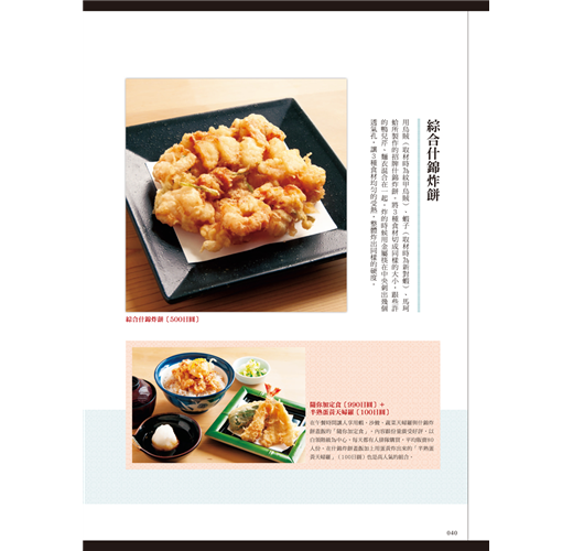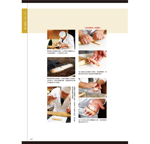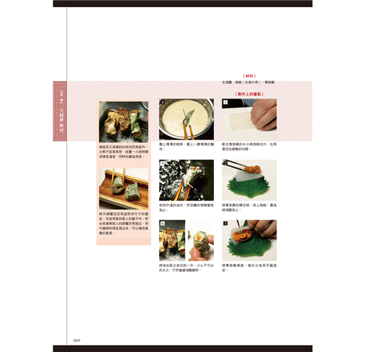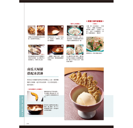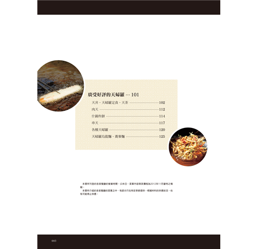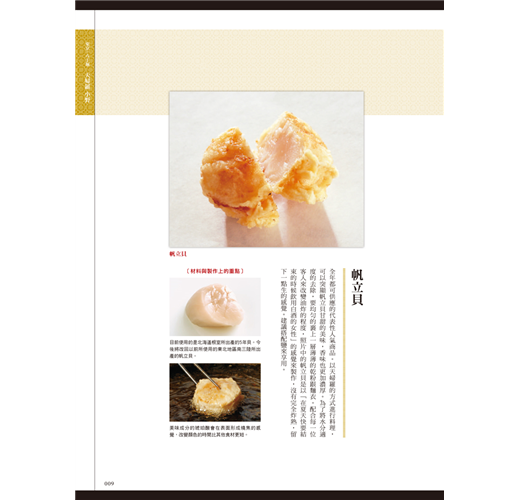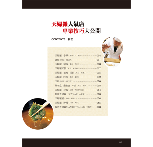 本書匯集了13家日本炸物店,介紹它們的經營方針,對於油、麵衣、醬料的要求。其中收錄將近百道的天婦羅料理。從常見的蝦、番薯、蔬菜的炸法,到生牡蠣青椒、蓮藕蝦等組合料理,均搭配圖解,解說材料與製作上的重點。