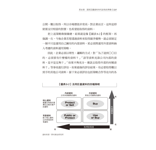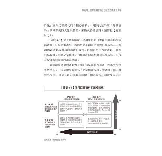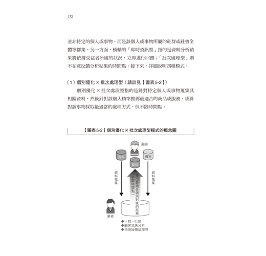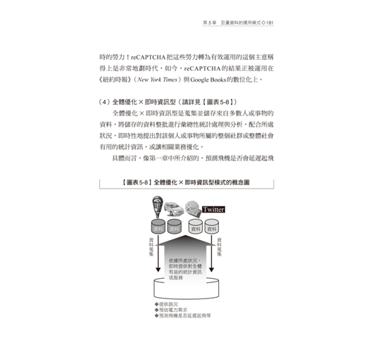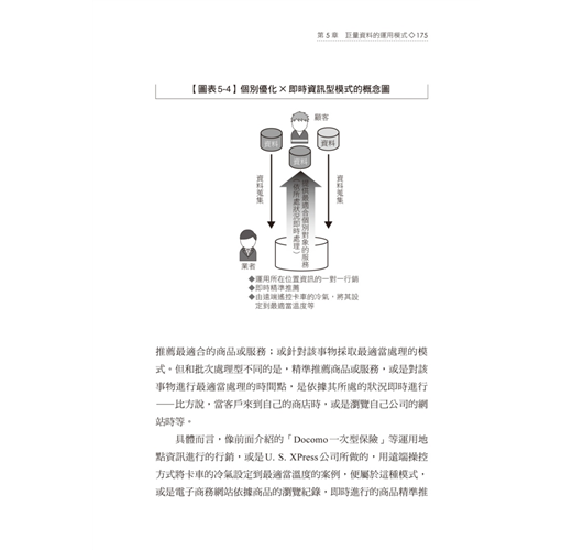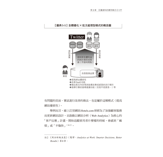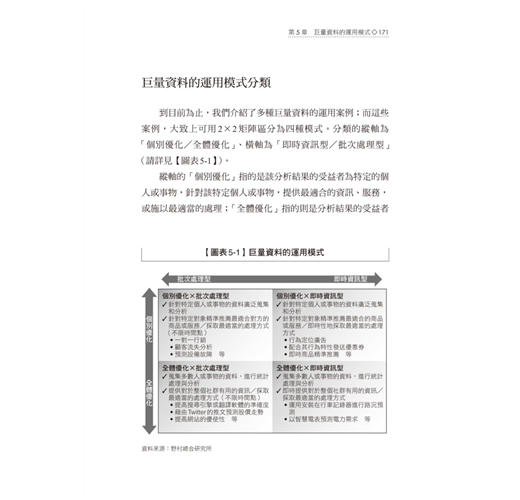 本書最令人讚歎的地方,在於作者將他研究企業應用巨量資料的成功案例,歸納成一張張淺顯易懂的圖表,其中,第五章【圖表5-1】巨量資料的運用模式,是一張相當精采的圖表,由個別最佳化、全體最佳化、批次處理與及時處理構成四種巨量資料運用的商業模式,滿足想要對於巨量資料獲利模式一探究竟的挑剔讀者們。