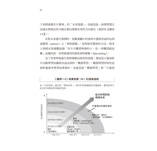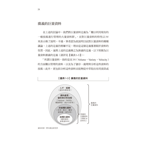 本書的內容在第一及第二章介紹了「巨量資料」在資訊科技技術上出現的許多新名詞,例如Hadoop、NoSQL、LOD 等;並且進一步解說企業在資料運用層面,從過去的「資料可視化」進展到「資料預測未來」的境界;因此,強調深層的資料調查以及準確度的預測,讓企業因為採用巨量資料的「技術」而進展到更高的境界。