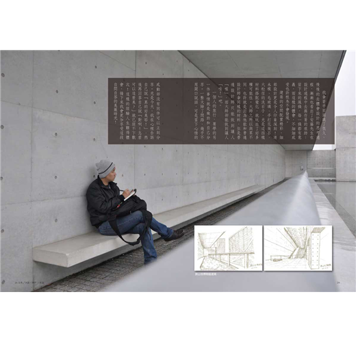 甚至連一張椅子也可以引起他的探究,而發現設計者的用心:「單純是它的質感與造型就讓我停留欣賞,在研究剖面與細部交接並畫圖的同時,我卻發現了這張椅子的驚喜。我說奇怪,為什麼我前面這對情侶的角度跟我低頭之前看到時不一樣?我正在想的同時,他們又再次滑動了厚重的椅子。原來這椅子是可以左右移動的,難怪階梯旁要有一整排的鋼板,也難怪階梯下方要有那段不尋常的退縮空間;瞬間恍然大悟的我又花了更多的時間,好好研究這張椅子。多人性化的設計!假如在你看湖的視線之前有不順眼的東西,只要推動這張椅子,想看哪裡就看哪裡!」看到書中的描述,我好想坐坐這張多麼用心設計的奇特椅子。另外,天豪還學著怎麼將想要表達的設計特色用相機拍出來,拍不出來的部分再自己畫,所以這本書真可說是圖文並茂。