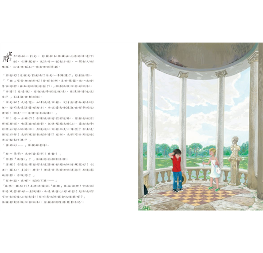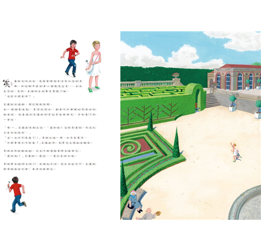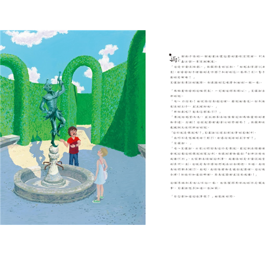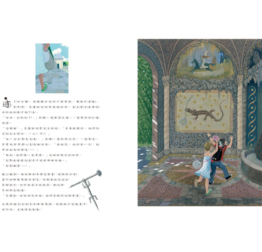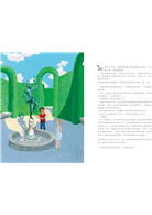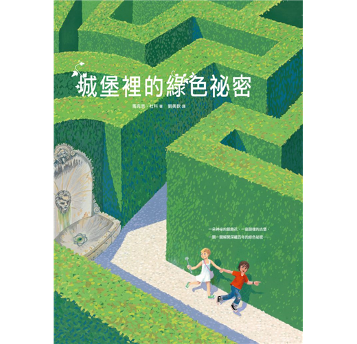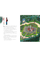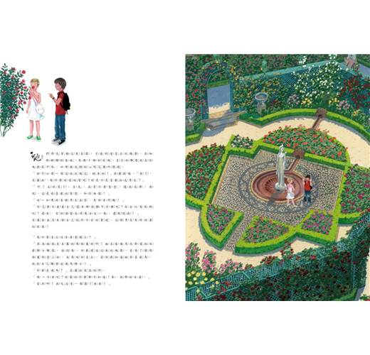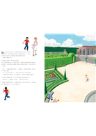 我一邊翻閱內文,一邊對照前扉頁的城堡平面圖,內心不禁嘆服作者在故事場景的空間和動線設計上,做了相當仔細合理的沙盤推演。讀者們不妨對照內文的每幅場景,都可以從平面圖中找到兩位小主角的所在位置。除此之外,雖然整張平面圖看似空無一人,但是在城堡入口處數字「21」的右上方,可以看到芙蘿拉的奶奶坐在長凳上,而這個位置正是芙蘿拉離開奶奶獨自冒險的起點,也是故事尾聲芙蘿拉回到原處與奶奶會合的地點;然後再往綠色迷宮的方向看過去,請讀者們仔細找一找,有沒有看到兩位小主角了?像這樣極具巧思、預留伏筆的手法,全書俯拾皆是,很值得讀者們一再細細品味。