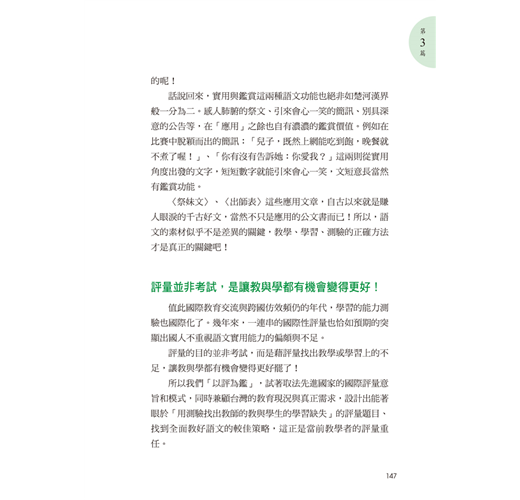 本書第一篇就很吸引人,林老師說故事的能力不在話下,但是他歸納出來的「撇步」,是書中精華。三不五時出現的「專欄」,我建議必讀,其中有教學概念的溝通和方法的傳遞。有一句話,「教育不會有也不該有曠古絕今的新奇點子。…只要和昨天有一點點不同,就成了今天的創新。不斷修正才是創新的精義」,這是經驗與反省。書中可以讀到協同教學、分組,也似乎有學習共同體的影子,但作者強調的是,聚焦教學現場,不須太多理論佐證,注意學生眼光中流露出的眼神,就知道教法上是否要改變、不斷修正。