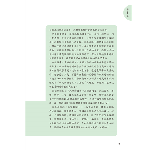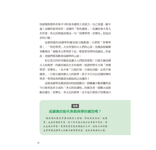 這本書有故事、有方法。書中的實例可以說服老師立志以帶起每一位孩子為目標。而書中的方法則幫助老師安心的教學,達成一個都不少的目標。