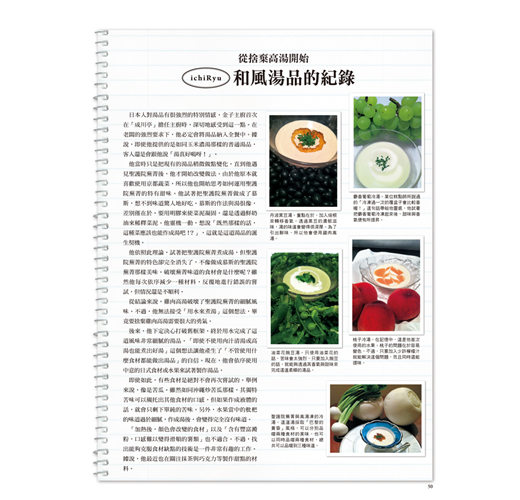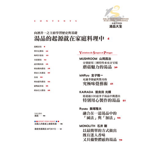 對皆良田主廚來說,湯品是一種「總是理所當然地出現在自己身旁」的料理。雖然他有時也會苦於無法決定新菜色,但只有在思考湯品時,靈感會自然地湧現。這次他要從超過100道拿手湯品中,為大家示範以「高橋德南先生直接傳授的味道」為首的許多道特製湯品。