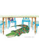 故事中,小女孩坐在餐桌前發呆,在小幅畫面看似平靜的流動中,桌上食物動也沒動,但桌布上的藤蔓卻越長越茂盛,暗示著小女孩坐了好久好久……。接著,鱷魚、熊熊、大野狼竟然出現在餐桌旁。有讀者忍不住發問:「這些動物訪客究竟是真的,還是小女孩自己的幻想?」