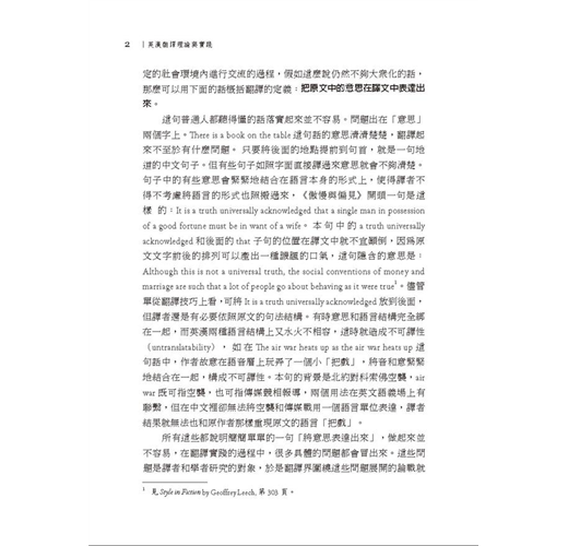 本書結合翻譯理論與實踐,除了介紹翻譯技能,更著重培養譯者的翻譯觀,使之對翻譯這種跨語言、文化的活動有深刻理解。在理論方面,綜合說明翻譯基本概念、技巧,以及與語言文化的對比關係,也包括中西翻譯理論的介紹。實踐方面,節錄政治、商業、新聞、科技、文學等各種領域的範文做為練習,審慎挑選參考譯文,加上精闢剖析、點評與批改意見,是理論與實踐兼備的重量級完整著作。