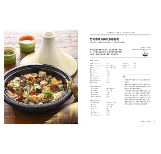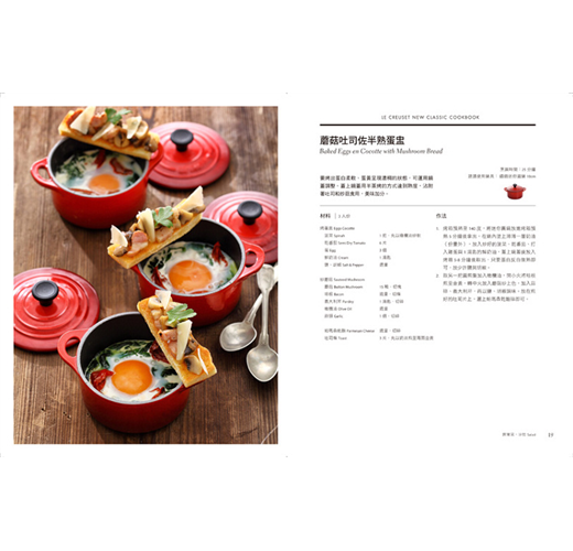 食譜裝幀設計採用方背硬殼穿線精裝,裱以充滿生活手感細麻布面,燙上金色經典LE CREUSET鍋身及品牌標準字,外包書衣印有足以代表「新・經典」主題的肉荳蔻色鑄鐵圓鍋。全彩內頁採用高質感美術紙印刷,將新・經典料理做了最完美演繹。光是擁有它,就足以讓生活開始美好!