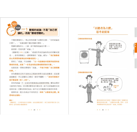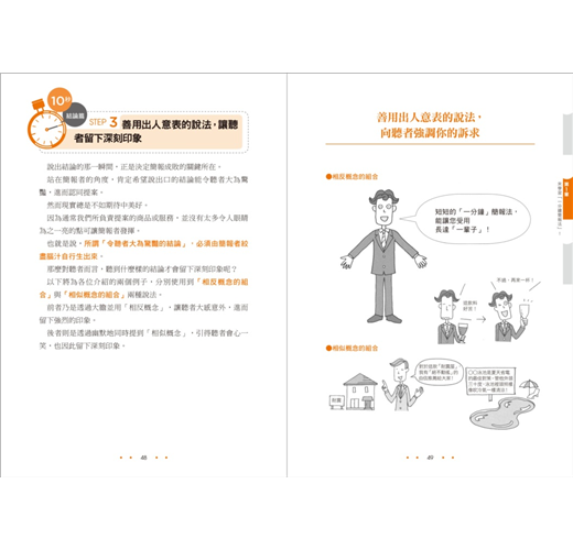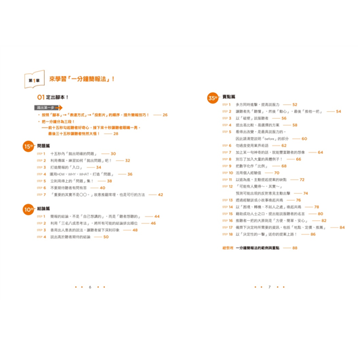 畢竟一分鐘之內不可能講太多話,一些非必要的事無法一一交代,於是在時間有限之下進行練習,便能習得下述的技術: