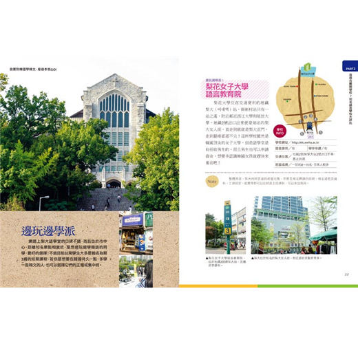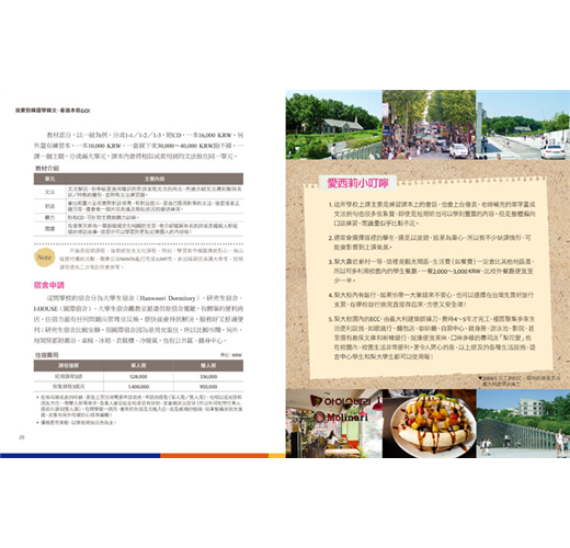 現在有了這本超實用的韓國遊學工具書,對想要到韓國學習韓文的朋友可說是一大利器!書中詳列了11所韓國大學附設語學堂的教學及上課方式、教材內容、校區設施、學校周邊生活機能與交通等相關資訊、就讀過的學生親身經驗談,幫大家省去不少在網站上收集資料及尋找經驗分享的時間。除此之外,每間語學堂介紹除了資訊性的內容之外,作者還提供了許多貼心小叮嚀,讓這本書更貼近實用的需求喔!