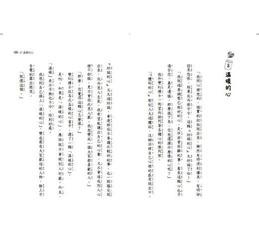 總之,作者以貼近孩子內心的聲音,具體的引導孩子透過學習觀察、閱讀反省、感受、體會同儕間該如何對話才不會傷到別人;啟發孩子將心比心去關心、欣賞、讚美他人的行為表現,去發現校園的快樂生活;也提醒孩子要持續做內心的對話與反省,才能找到自己的「真心」,好好與人相處。