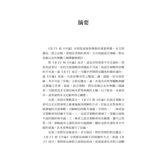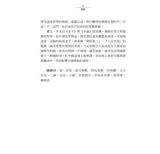 長久以來,道家與佛教皆被視為有智慧的哲學學門或宗教;其中老子以「道」為本,透露出對世間深刻的觀察,告訴人如何以柔克剛、保全長生,而龍樹以「空」為宗,以破邪顯正、斷疑生明,如此「道」與「空性」都是老學與中觀學為人津津樂道之處,也是令西方學人關注之所在。但老子與龍樹思想之洞見究在何處,兩者如何表現智慧,以及之間的智慧有何異同等,成了耐人尋味的問題,如此兩者的對比探討具有高度價值。