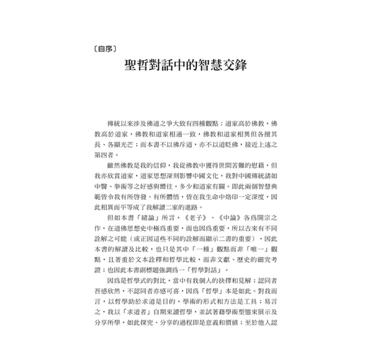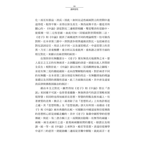 本書跳脫中國思想史上道、佛錯綜複雜的交涉糾葛,跳脫「格義佛教」窠臼,回溯到原始道家及初期(大小乘)佛教,以《老子》與《中論》為例,直探道、佛的根本見解,考察對比原初義理系統的異同,使在此基礎上助於思考佛、道交涉的課題,乃至思考佛學中國化、老莊化過程中可能的轉捩點。就此而言,本書可視為探討道、佛關係的基礎性研究,乃探究道、佛思想暨中國哲學必備之作!
