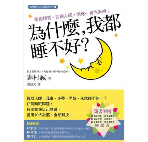 生活習慣、環境、飲食都可能是倒致都夏紊亂,引起睡眠障礙的原因。作者蓮村誠不僅清楚地說明了各種狀況,也針對不同失衡理由,各自提供了方法簡單、明確的自我療法。例如泡澡能幫助睡眠,但風能失衡可以泡熱一點的半身浴,火能失衡卻該要避免泡太熱、太久。