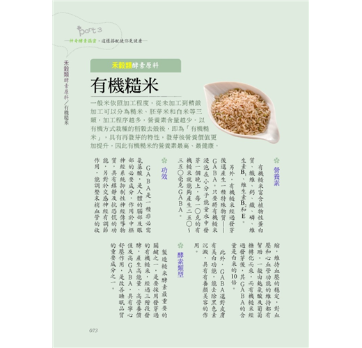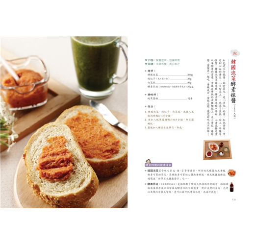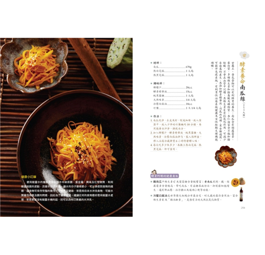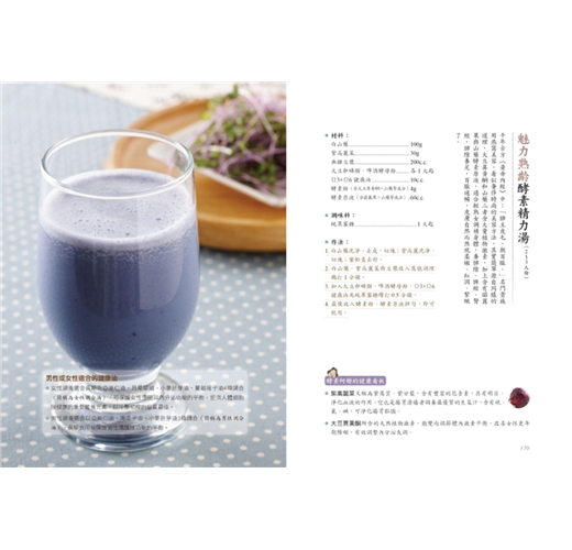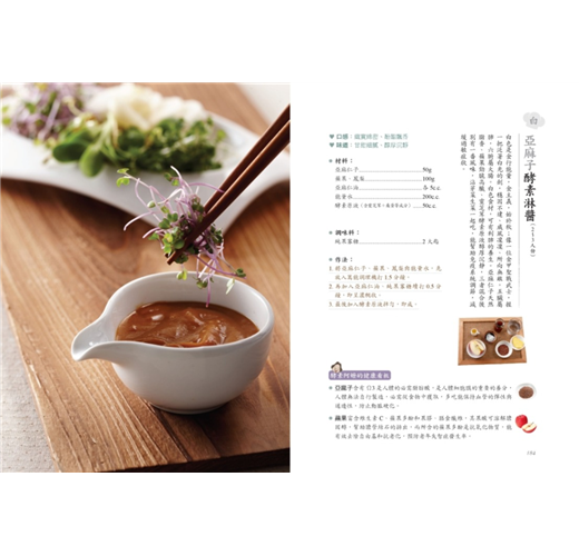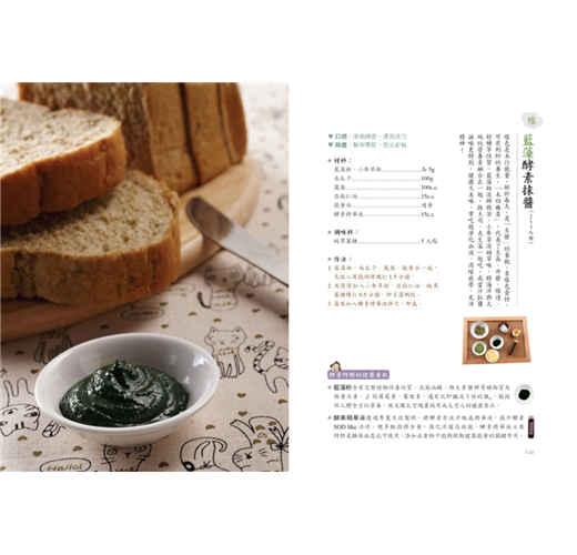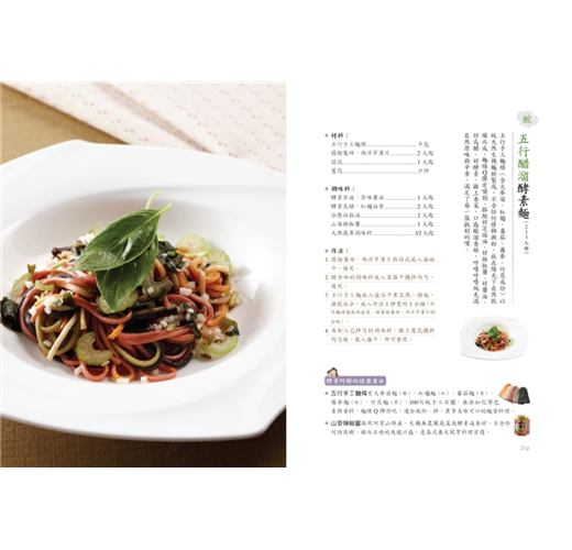 而且食譜中除了酵素外,更將常見市售、吃了會健康但一點都不好吃的營養保健品,如藍藻、啤酒酵母、大麥苗粉….等一起入菜,讓營養品成為餐桌上美味的料理,其中更帶入五行養生的概念與做法,讓蔬食走入更健康養生的新境界!