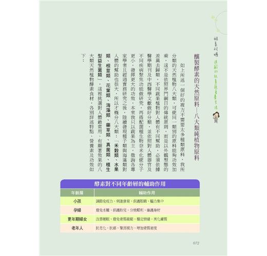 酵素在近幾年已被眾多醫師、學者、有機專家們認可是維持健康及長壽高能量的元素。人體要提升生命的健康力,必須先強化體內細胞。但您可知道不同食物發酵出來的酵素,對身體也有不同的影響?本書就羅列八大類天然植物酵素食材,將四十餘種常見的酵素原料對身體的影響與營養成份詳細說明,並將大眾對酵素的常見疑惑進行解說,讓您不只知道酵素,還能更確切瞭解自己應該如何攝取適合自己的酵素。