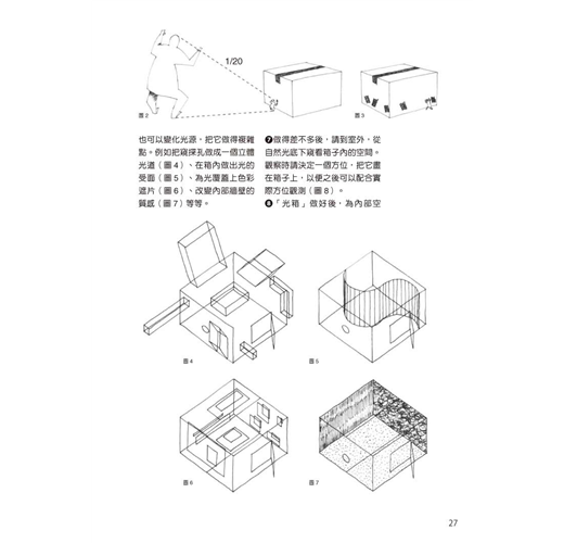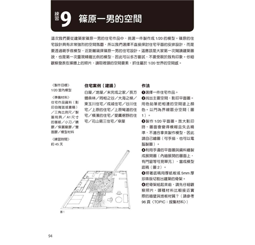 第一個習題是「光線」。建築史裡與光有關的資訊廣博浩瀚,但大學裡的課程卻只有短短五、六個星期,要在這麼短的期間內讓學生掌握光的概念,與其讓他們單方面地欣賞作品,還不如讓他們用自己的手操作自然光,製造出新的光線氛圍,即使是模仿別人的手法也不無不可。畢竟透過自己的手實際體驗,一定會有更深的體會。這就是「光箱」這堂練習課的目標。至於乍看之下跟建築與空間毫無關係的「野餐」呢?是讓同學們分為數人一組,到戶外利用各種工具製造出具有社交性的野餐空間。儘管遊戲規則一樣,可是有些野餐空間很有趣,有些卻很乏味。當下也許同學並不了解是什麼造成這種差別,可是沒關係,只要知道野餐空間也是空間的一種就好了。至於「篠原一男的空間」則是讓同學們從建築家篠原一男(1925-2006)的38 棟住宅作品中,選出喜歡的一棟,做成1/20 的模型。篠原一輩子都把獨棟住宅視為主力戰場,他的名氣響遍海內外,不知道這個人的話可是會被當成半吊子哦。篠原先生曾發表過許多狂傲的言論,因此若是只讀到些片面文章,容易對他產生誤解。他的空間無可否認地具有某種超凡脫俗的力量。我希望各位能在1/20 模型裡重現他的空間。製作時,只要在乎室內空間,毋須留意外表是否美觀。如果順利的話,就能從篠原先生的作品裡體會到無論是尺度多小的案子,都能呈現出精采而非凡的空間。等各位體驗過真正偉大的建築家所設計的空間具有如何動人的力量後,就輪到你們把自己的房間改造成足以稱為「空間」的場域了。這就是「把你的房間空間化」這個練習,也是經歷本書各個練習後,驗收成果的時刻。這個練習的重點在於各位有沒有辦法把房間改造成具有空間質地、讓人看了會想來參觀的房間。再經過設計、購買材料動手改造後。在課堂上,我們會請同學分享照片。從照片中,我們可以看出學生是否已經了解,什麼樣的空間才是動人而有趣的。