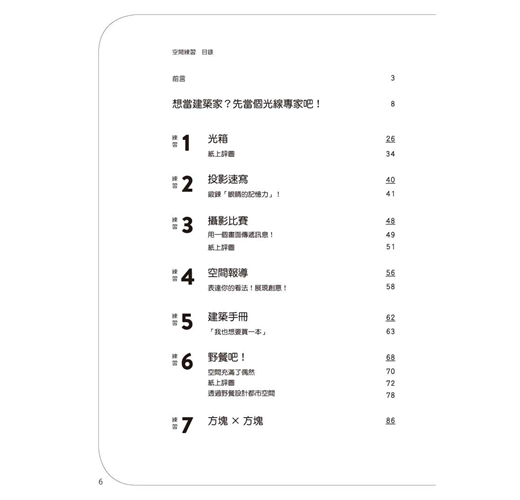 在建築訓練的路途上,最難的不是在大學或研究所中完成一個個艱辛無比的設計、也不是那無數次的評圖,這些其實都只是次要練習。真正的練習,是各位出了學校後所累積的實務經驗,那才能幫助各位設計出實際的建築物。這也是學習建築設計不同於音樂、攝影或繪畫的地方。該怎麼挺過如此漫長的練習?其實最好的辦法就在一開始接觸到建築領域時,先體會到空間有多麼地美好。因此這本《空間練習》中,完全沒提及任何令人皺眉的繪圖技巧,在教導各位身為一個建築師應當具備的技術前,更應喚醒各位對於空間的興趣。這就是本書的目標。