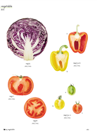 番茄、南瓜、黃甜椒、酪梨、紫甘藍…本章蔬菜也有完整及剖面兩種圖片,大自然美麗的色彩讓設計作品增添一份清爽感。