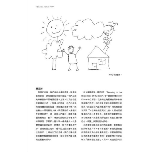 許多範例都闡述了視覺筆記的多項妙用,可提升讀者對環境更敏銳的察覺力、幫助解決設計難題,甚至透過課堂和演講中獲益更多。同時,書中也探討了各種適用於作為視覺筆記的筆記本形式。