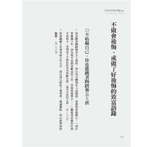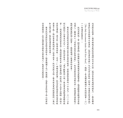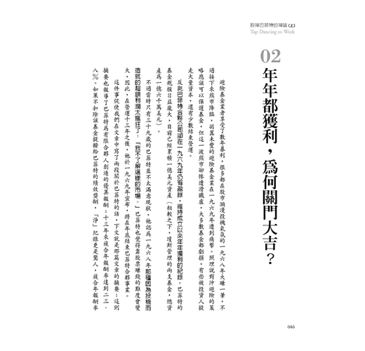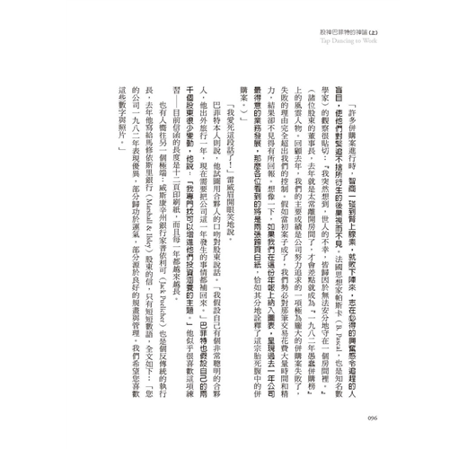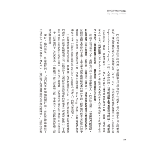 不過,我靈光一閃,想到《財富雜誌》刊登過許多巴菲特文章,它們本身,豈不就是一部活生生的商業傳記?當作一本書來看,再合適不過。於是,就有了各位讀者手上的這本《跳著踢踏舞去上班》——巴菲特最喜歡用這句話,形容他熱愛經營波克夏的心情。