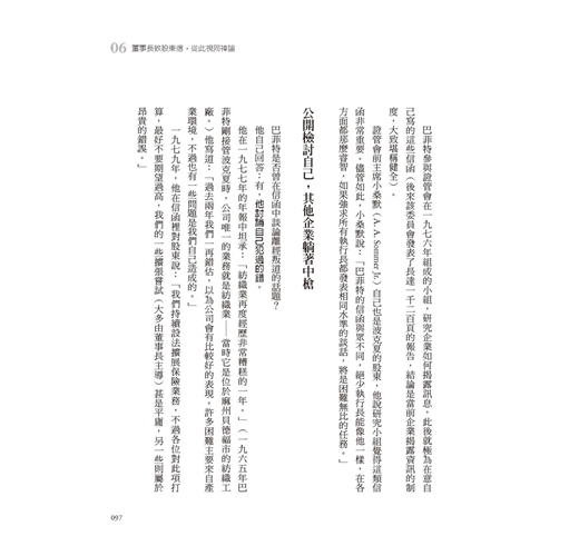 本書中間部分由我在1988年寫的一篇人物專訪打頭陣,標題是「解密:巴菲特的內幕故事」(見第15章),描述他如何在投資老本行之外再添第二項專業——企業管理,後來他果真將波克夏打理成美國企業界的一支雄兵。