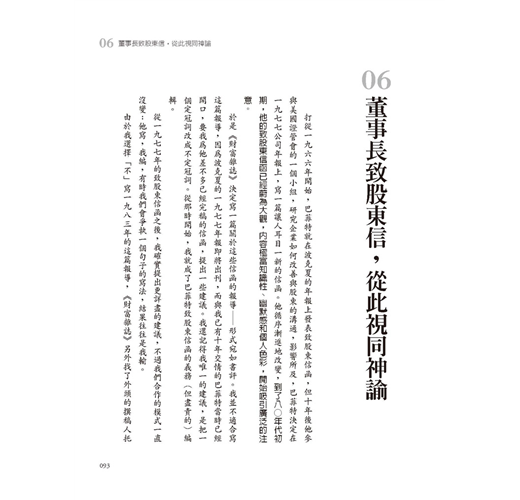 本書囊括《財富雜誌》所有以巴菲特為主角的重量級文章,另有一些輕鬆短文,如〈這樣做,有錢又有名〉(見下冊第38章)。在這些重量級文章裡,每一篇我都寫了導言或評論,總數約四十篇。這些內容的功能,是解釋每一篇文章的重要之處、巴菲特哪些預測成真或失靈、時至今日他對當初文章的主旨有何看法。