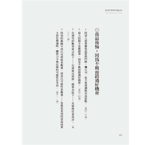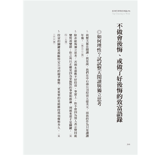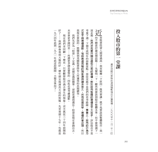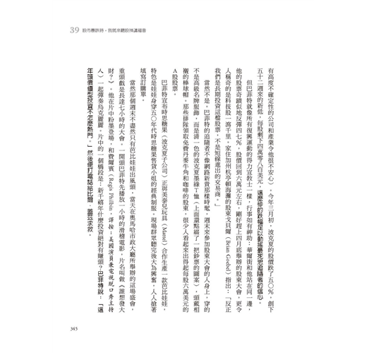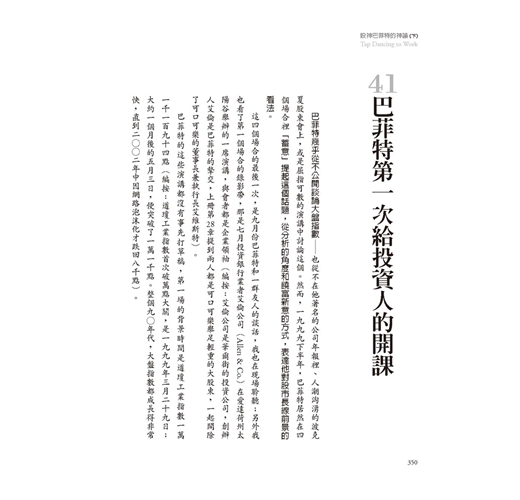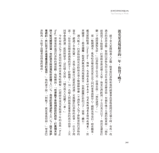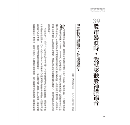 不過,我靈光一閃,想到《財富雜誌》刊登過許多巴菲特文章,它們本身,豈不就是一部活生生的商業傳記?當作一本書來看,再合適不過。於是,就有了各位讀者手上的這本《跳著踢踏舞去上班》——巴菲特最喜歡用這句話,形容他熱愛經營波克夏的心情。