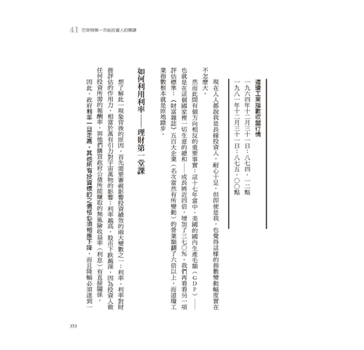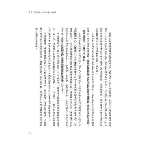 本書囊括《財富雜誌》所有以巴菲特為主角的重量級文章,另有一些短文,如〈吉米.巴菲特和華倫.巴菲特是血親嗎?〉(下冊第38章)。在這些重量級文章裡,每一篇我都寫了導言或評論,總數約四十篇。這些內容的功能,是解釋每一篇文章的重要之處、巴菲特哪些預測成真或失靈、時至今日他對當初文章的主旨有何看法。