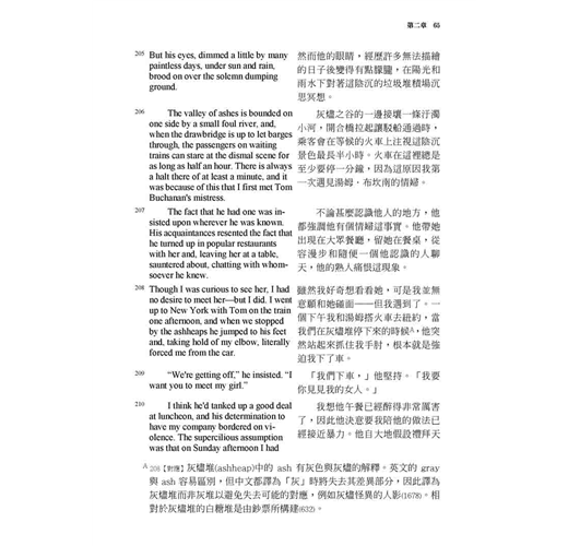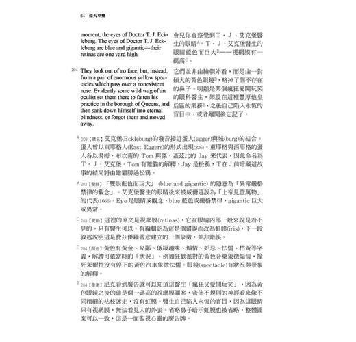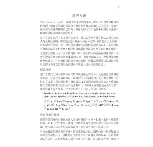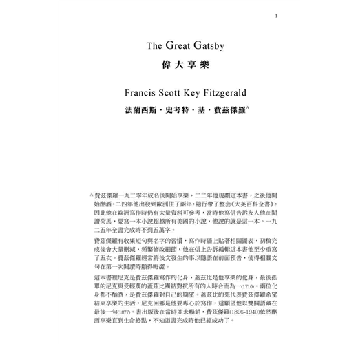 The Great Gatsby 是一本偉大的文字偵探小說,唯有找出費茲傑羅用字的來源才能真正解讀這部經典,體會其中難以想像的文字之美。英翻中後原文的美感與雙關多已消失,最好的解決方法是英中對照再加注解,閱讀時可略過腳註或隨時參考。
