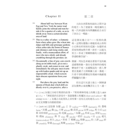 逐字意譯找出英文字詞的中文解釋後再組合成句,不允許過度意譯與避免漏譯,全書皆依循此規範。複雜的句子於腳註列出英中單字對應,這時的英文單字都回到原形。例如尼克決定要回家鄉時正是秋天,費茲傑羅不直接用秋天而改以長串敘述來取代:「因此,青煙脆葉在天空之時,風吹得繩上濕衣直挺,我決定回家了」(1843),這句可分解為: