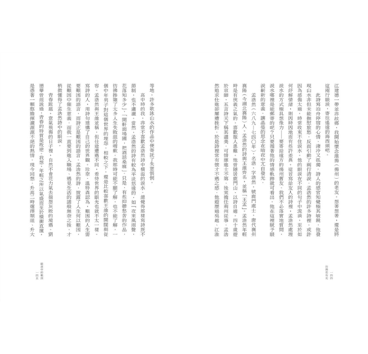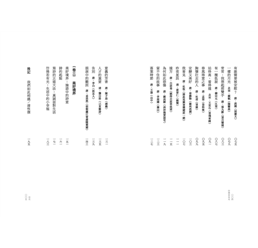 張潮《幽夢影》裡說:「少年讀書,如隙中窺月;中年讀書,如庭中望月;老年讀書,如臺上玩月。皆以閱歷之淺深,為所得之淺深耳。」人事閱歷的淺深,正可與讀書體驗相互發揚。讀詩或許也是這樣,遭遇和心境轉變了之後,從文句中咀嚼到的滋味也就多所不同。依稀記得,中學時的我搭公車上學,在車上不是背英文單字就是在背詩。我深覺其中有一股魔力,聲音抑揚頓挫的魔力,引領我進入充滿意義的世界。這個意義,不在於為人生提供現實功利的滿足,而是去發現存在的景象是何其豐美。那些草木鳥獸之名,構築了詩意的園林。詩讓我斂起倦極的羽翼,獲得充分的依靠,完整的休息。