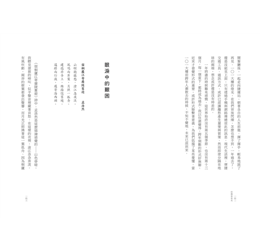 我們是如此相遇的。這樣的時刻,即使是孤獨一人,也覺得世界與我不相疏離。世界在我眼中,我在世界的懷裡。周遭再怎麼喧囂,都無法干礙一顆心的安穩定靜。或許這就是詩意的開端,與他人照面,與世界照面,然後重新與自己相遇。外在的風景,常常呼喚出某些古典詩的句子。小時候背誦過的韻律都是舊時相識,不自覺地湧現,與當下的人生產生對應。